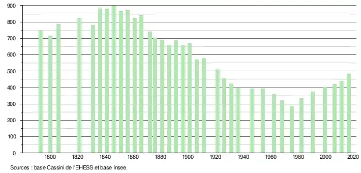 L'évolution du nombre d'habitants est connue à travers les recensements de la population effectués dans la commune depuis 1793. Pour les communes de moins de 10 000 habitants, une enquête de recensement portant sur toute la population est réalisée tous les cinq ans, les populations légales des années intermédiaires étant quant à elles estimées par interpolation ou extrapolation[2]. Pour la commune, le premier recensement exhaustif entrant dans le cadre du nouveau dispositif a été réalisé en 2006[3].