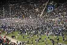 Les fans envahissant le LaVell Edwards Stadium en 2009 après la victoire en prolongation sur le score de 26 à 23 de #19 BYU sur #21 Utah.