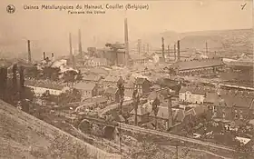 Au début du XIXe siècle, l'aspect de Couillet change radicalement avec le début de la Révolution industrielle. Des charbonnages s'installent aux Festiaux et à la limite de Marcinelle et y extraient la houille. En 1835, un grand complexe sidérurgique s'installe dans la vallée de la Sambre, construit par la Société des Hauts-Fourneaux, Usines et Charbonnages de Marcinelle et Couillet. Cette usine est alors la plus grande fabrique de fer de la Belgique construite sous la forme de sept grands hauts-fourneaux dédiés à la fonte au coke, complétés par un vaste atelier de construction et un laminoir. Sortent notamment de ces usines les locomotives à vapeur Couillet-Hainaut vendues en Belgique et dans le monde entier. Le combustible vient des houillères de Marcinelle[26]. Le minerai est acheminé via la rive droite de la Sambre et les voies ferrées.
