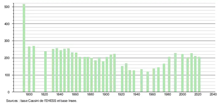 L'évolution du nombre d'habitants est connue à travers les recensements de la population effectués dans la commune depuis 1793. Pour les communes de moins de 10 000 habitants, une enquête de recensement portant sur toute la population est réalisée tous les cinq ans, les populations légales des années intermédiaires étant quant à elles estimées par interpolation ou extrapolation[19]. Pour la commune, le premier recensement exhaustif entrant dans le cadre du nouveau dispositif a été réalisé en 2006[20].