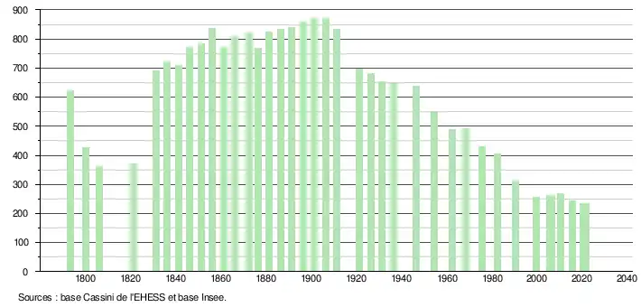 L'évolution du nombre d'habitants est connue à travers les recensements de la population effectués dans la commune depuis 1793. Pour les communes de moins de 10 000 habitants, une enquête de recensement portant sur toute la population est réalisée tous les cinq ans, les populations légales des années intermédiaires étant quant à elles estimées par interpolation ou extrapolation[25]. Pour la commune, le premier recensement exhaustif entrant dans le cadre du nouveau dispositif a été réalisé en 2005[26].