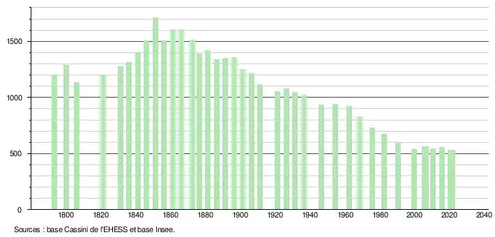 L'évolution du nombre d'habitants est connue à travers les recensements de la population effectués dans la commune depuis 1793. Pour les communes de moins de 10 000 habitants, une enquête de recensement portant sur toute la population est réalisée tous les cinq ans, les populations légales des années intermédiaires étant quant à elles estimées par interpolation ou extrapolation[49]. Pour la commune, le premier recensement exhaustif entrant dans le cadre du nouveau dispositif a été réalisé en 2005[50].