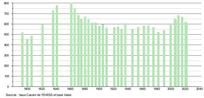 L'évolution du nombre d'habitants est connue à travers les recensements de la population effectués dans la commune depuis 1793. Pour les communes de moins de 10 000 habitants, une enquête de recensement portant sur toute la population est réalisée tous les cinq ans, les populations légales des années intermédiaires étant quant à elles estimées par interpolation ou extrapolation[18]. Pour la commune, le premier recensement exhaustif entrant dans le cadre du nouveau dispositif a été réalisé en 2005[19].