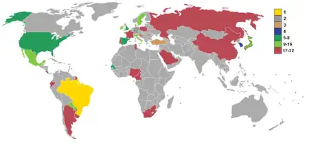 - Europe (UEFA) : 14 ou 15[5] places pour 51 équipes, dont une automatiquement attribuée au champion en titre (France) ;