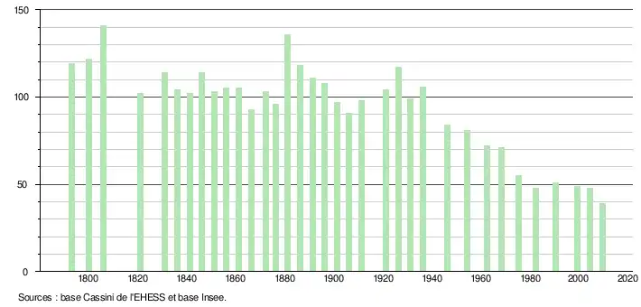 - Dans le tableau des recensements et le graphique, par convention dans Wikipédia, le principe a été retenu, pour les populations légales postérieures à 1999 de n’afficher dans le tableau des recensements et le graphique que les populations correspondant à l'année 2006, première population légale publiée calculée conformément aux concepts définis dans le décret no 2003-485 du 5 juin 2003, et les années correspondant à une enquête exhaustive de recensement pour les communes de moins de 10 000 habitants, ainsi que la dernière population légale publiée par l’Insee.