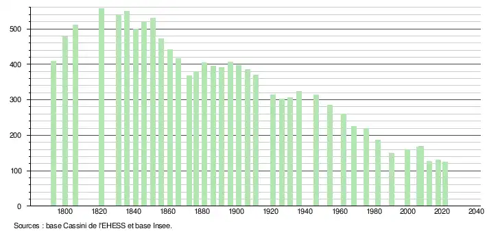L'évolution du nombre d'habitants est connue à travers les recensements de la population effectués dans la commune depuis 1793. Pour les communes de moins de 10 000 habitants, une enquête de recensement portant sur toute la population est réalisée tous les cinq ans, les populations légales des années intermédiaires étant quant à elles estimées par interpolation ou extrapolation[17]. Pour la commune, le premier recensement exhaustif entrant dans le cadre du nouveau dispositif a été réalisé en 2007[18].