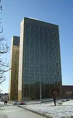 Tous les organes judiciaires de l'Union sont basés au Luxembourg, séparés des institutions politiques basées à Bruxelles et Strasbourg. La Cour de Justice est installée dans le bâtiment du Palais, actuellement en expansion, dans le quartier luxembourgeois de Kirchberg. En 1996, dans la perspective de l’élargissement de la Communauté, la mission d’opérer une nouvelle extension et de tripler la capacité de la Cour est confiée à l’équipe menée par Dominique Perrault. Évidant entièrement le bâtiment initial, tout d’acier corten, afin d’y installer les salles d’audience, et de le rendre intégralement à sa vocation de justice, l’architecte l’entoure d’un anneau parfaitement orthogonal qui s’inscrit comme en suspension dans le paysage et accueille les bureaux et cabinets des juges et des avocats généraux ainsi que la Grande salle des délibérés. En contrebas de ce corps majeur, la grande galerie de liaison est réorganisée, étendue, servant ainsi d’épine dorsale à l’ensemble dans son rôle de liaison avec les contreforts de la deuxième extension, dans le même temps qu’elle distribue les circulations vers deux nouvelles tours de 103 mètres, les plus hautes du pays. L’ensemble de ces opérations a été terminé en 2008. Une troisième tour, plus imposante encore, est en cours d’élaboration par Dominique Perrault Architecture[8].