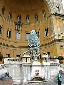 On accède à la cour supérieure, appelée Cortile della Pigna, au moyen d'un escalier à double cage en papillon. La perspective de la cour est achevée, dans le projet de Bramante, par un exèdre semi-circulaire qui sert de point de perspective de l'ensemble architectural et permet de masquer la villa du Belvedere. La niche qui la complète sera achevée en 1565, par Pirro Ligorio. Au centre de cette niche se trouve la pomme de pin en bronze qui remonte à l'époque romaine. C'est pour cela que la cour supérieure est aussi appelée la cour de la pomme de pin.