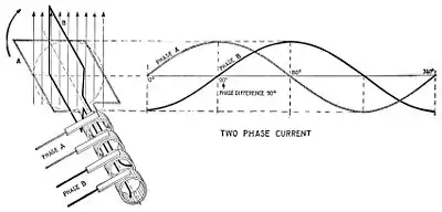 Le système diphasé est un système également à deux phases de même fréquence et de mêmes amplitudes, cependant ces deux phases ne sont plus en opposition, mais en quadrature (déphasées entre elles de 90° ou π/2 radians)[1],[2]. Des systèmes diphasés ont pu être utilisés (ou sont encore utilisés) grâce à des distributions à trois ou quatre fils : quatre fils fournissant deux tensions en quadrature indépendantes ou trois fils avec un point commun[1].