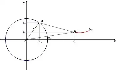 Il s’agit d’établir l'équation de la trajectoire de poursuite que parcourt un chien lorsque son maître, éloigné, l'appelle tout en se déplaçant sur une trajectoire circulaire. On conviendra que le maître se déplace de façon uniforme à la vitesse « v » et dans le sens trigonométrique. Le chien accourt à une vitesse « kv » et de façon à être, à tout moment, dirigé vers son maître. Au bout du temps « t » on convient que le maître s’est déplacé de « Mo » à « M' », c'est-à-dire d’un angle « ω = vt/r »