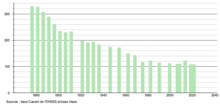 L'évolution du nombre d'habitants est connue à travers les recensements de la population effectués dans la commune depuis 1876. Pour les communes de moins de 10 000 habitants, une enquête de recensement portant sur toute la population est réalisée tous les cinq ans, les populations légales des années intermédiaires étant quant à elles estimées par interpolation ou extrapolation[21]. Pour la commune, le premier recensement exhaustif entrant dans le cadre du nouveau dispositif a été réalisé en 2008[22].