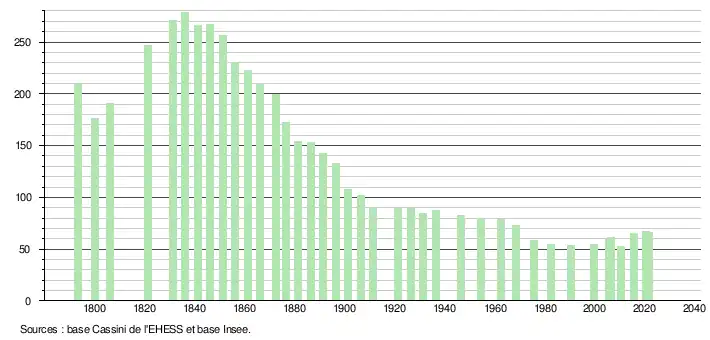 L'évolution du nombre d'habitants est connue à travers les recensements de la population effectués dans la commune depuis 1793. Pour les communes de moins de 10 000 habitants, une enquête de recensement portant sur toute la population est réalisée tous les cinq ans, les populations légales des années intermédiaires étant quant à elles estimées par interpolation ou extrapolation[26]. Pour la commune, le premier recensement exhaustif entrant dans le cadre du nouveau dispositif a été réalisé en 2005[27].