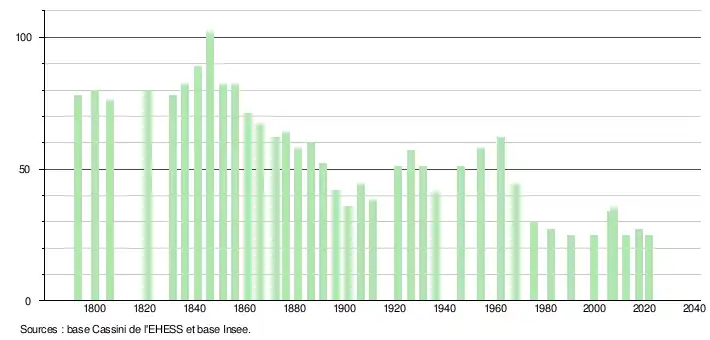L'évolution du nombre d'habitants est connue à travers les recensements de la population effectués dans la commune depuis 1793. Pour les communes de moins de 10 000 habitants, une enquête de recensement portant sur toute la population est réalisée tous les cinq ans, les populations légales des années intermédiaires étant quant à elles estimées par interpolation ou extrapolation[15]. Pour la commune, le premier recensement exhaustif entrant dans le cadre du nouveau dispositif a été réalisé en 2007[16].