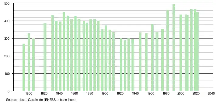 L'évolution du nombre d'habitants est connue à travers les recensements de la population effectués dans la commune depuis 1793. Pour les communes de moins de 10 000 habitants, une enquête de recensement portant sur toute la population est réalisée tous les cinq ans, les populations légales des années intermédiaires étant quant à elles estimées par interpolation ou extrapolation[17]. Pour la commune, le premier recensement exhaustif entrant dans le cadre du nouveau dispositif a été réalisé en 2008[18].
