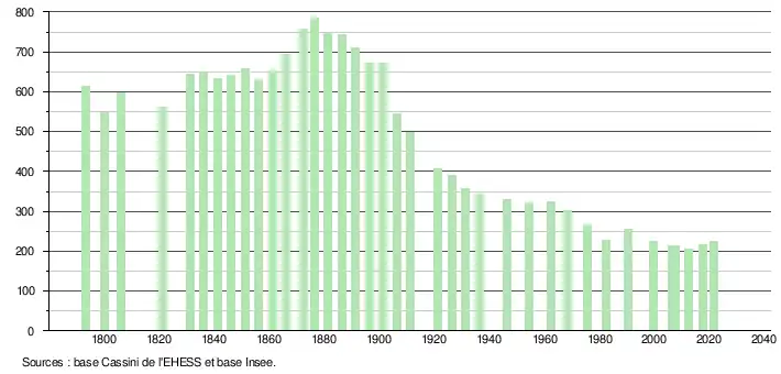 L'évolution du nombre d'habitants est connue à travers les recensements de la population effectués dans la commune depuis 1793. Pour les communes de moins de 10 000 habitants, une enquête de recensement portant sur toute la population est réalisée tous les cinq ans, les populations légales des années intermédiaires étant quant à elles estimées par interpolation ou extrapolation[23]. Pour la commune, le premier recensement exhaustif entrant dans le cadre du nouveau dispositif a été réalisé en 2007[24].