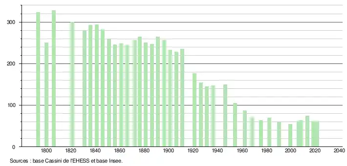 L'évolution du nombre d'habitants est connue à travers les recensements de la population effectués dans la commune depuis 1793. Pour les communes de moins de 10 000 habitants, une enquête de recensement portant sur toute la population est réalisée tous les cinq ans, les populations légales des années intermédiaires étant quant à elles estimées par interpolation ou extrapolation[15]. Pour la commune, le premier recensement exhaustif entrant dans le cadre du nouveau dispositif a été réalisé en 2008[16].