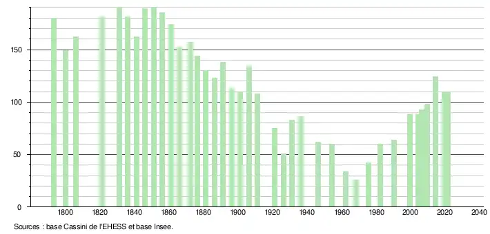 L'évolution du nombre d'habitants est connue à travers les recensements de la population effectués dans la commune depuis 1793. Pour les communes de moins de 10 000 habitants, une enquête de recensement portant sur toute la population est réalisée tous les cinq ans, les populations légales des années intermédiaires étant quant à elles estimées par interpolation ou extrapolation[35]. Pour la commune, le premier recensement exhaustif entrant dans le cadre du nouveau dispositif a été réalisé en 2004[36].