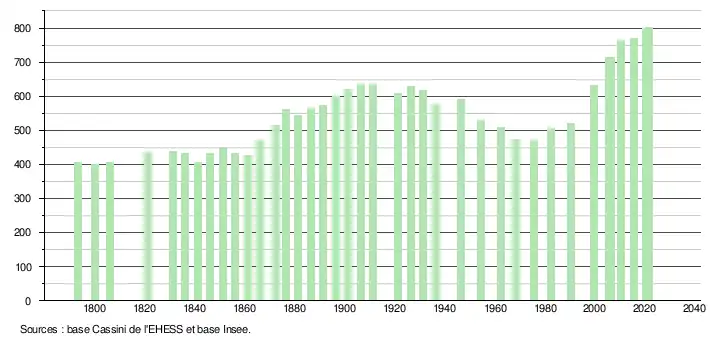L'évolution du nombre d'habitants est connue à travers les recensements de la population effectués dans la commune depuis 1793. Pour les communes de moins de 10 000 habitants, une enquête de recensement portant sur toute la population est réalisée tous les cinq ans, les populations légales des années intermédiaires étant quant à elles estimées par interpolation ou extrapolation[17]. Pour la commune, le premier recensement exhaustif entrant dans le cadre du nouveau dispositif a été réalisé en 2005[18].