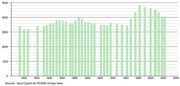 - Population municipale légale en vigueur au 1er janvier 2024, millésimée 2021, définie dans les limites territoriales en vigueur au 1er janvier 2023, date de référence statistique : 1er janvier 2021.