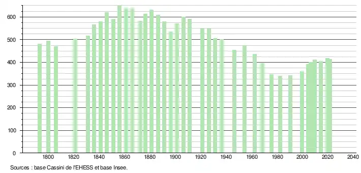 L'évolution du nombre d'habitants est connue à travers les recensements de la population effectués dans la commune depuis 1793. Pour les communes de moins de 10 000 habitants, une enquête de recensement portant sur toute la population est réalisée tous les cinq ans, les populations légales des années intermédiaires étant quant à elles estimées par interpolation ou extrapolation[23]. Pour la commune, le premier recensement exhaustif entrant dans le cadre du nouveau dispositif a été réalisé en 2004[24].