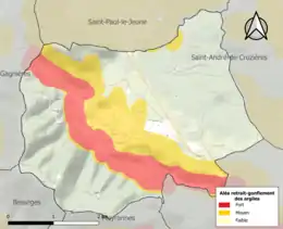 La commune est vulnérable au risque de mouvements de terrains constitué principalement du retrait-gonflement des sols argileux[18]. Cet aléa est susceptible d'engendrer des dommages importants aux bâtiments en cas d’alternance de périodes de sécheresse et de pluie. 34,5 % de la superficie communale est en aléa moyen ou fort (67,5 % au niveau départemental et 48,5 % au niveau national). Sur les 221 bâtiments dénombrés sur la commune en 2019, 179 sont en aléa moyen ou fort, soit 81 %, à comparer aux 90 % au niveau départemental et 54 % au niveau national. Une cartographie de l'exposition du territoire national au retrait gonflement des sols argileux est disponible sur le site du BRGM[19],[Carte 2].