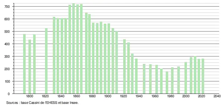 L'évolution du nombre d'habitants est connue à travers les recensements de la population effectués dans la commune depuis 1793. Pour les communes de moins de 10 000 habitants, une enquête de recensement portant sur toute la population est réalisée tous les cinq ans, les populations légales des années intermédiaires étant quant à elles estimées par interpolation ou extrapolation[23]. Pour la commune, le premier recensement exhaustif entrant dans le cadre du nouveau dispositif a été réalisé en 2006[24].