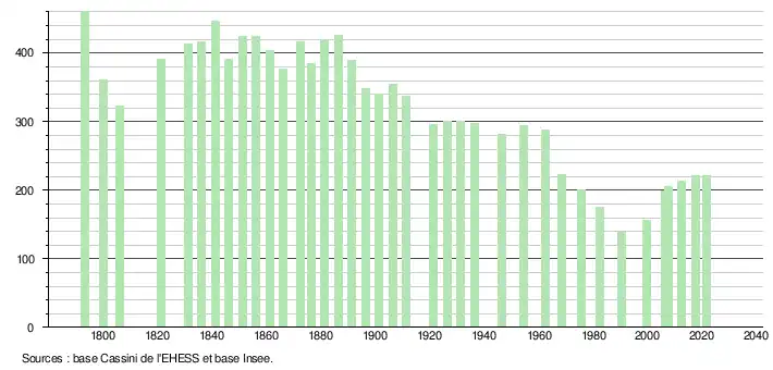 L'évolution du nombre d'habitants est connue à travers les recensements de la population effectués dans la commune depuis 1793. Pour les communes de moins de 10 000 habitants, une enquête de recensement portant sur toute la population est réalisée tous les cinq ans, les populations légales des années intermédiaires étant quant à elles estimées par interpolation ou extrapolation[32]. Pour la commune, le premier recensement exhaustif entrant dans le cadre du nouveau dispositif a été réalisé en 2007[33].
