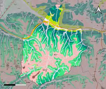 L'occupation des sols de la commune, telle qu'elle ressort de la base de données européenne d’occupation biophysique des sols Corine Land Cover (CLC), est marquée par l'importance des territoires agricoles (57,6 % en 2018), néanmoins en diminution par rapport à 1990 (60,2 %). La répartition détaillée en 2018 est la suivante : forêts (36,3 %), zones agricoles hétérogènes (22,9 %), terres arables (21,1 %), prairies (13,6 %), zones urbanisées (4,6 %), espaces verts artificialisés, non agricoles (1,4 %)[29]. L'évolution de l’occupation des sols de la commune et de ses infrastructures peut être observée sur les différentes représentations cartographiques du territoire : la carte de Cassini (XVIIIe siècle), la carte d'état-major (1820-1866) et les cartes ou photos aériennes de l'IGN pour la période actuelle (1950 à aujourd'hui)[Carte 3].