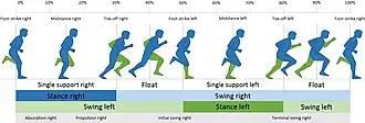 Le geste du coureur est différent selon l'allure. La phase d'appui débute au contact du pied avec sol : appelée attaque du pied[16], cette sous-phase est caractérisée par trois principaux types de poses de pied (attaque talon appelée aussi phase taligrade, attaque médio-pied et attaque avant-pied appelée également attaque digitigrade)[17]. La propulsion débute une fois que le talon décolle du sol, et se termine au moment où les orteils quittent à leur tour le sol. En sprint, le contact au sol est rapide, impulsif, l'avant-pied à plat, en mouvement de griffé.