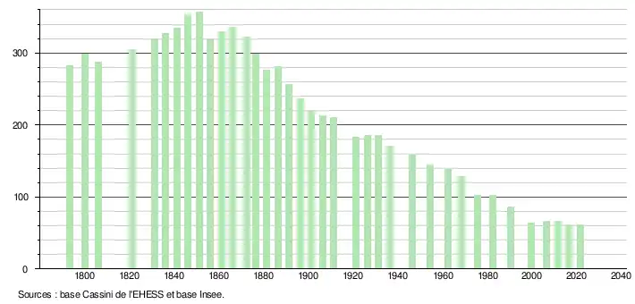 L'évolution du nombre d'habitants est connue à travers les recensements de la population effectués dans la commune depuis 1793. Pour les communes de moins de 10 000 habitants, une enquête de recensement portant sur toute la population est réalisée tous les cinq ans, les populations légales des années intermédiaires étant quant à elles estimées par interpolation ou extrapolation[19]. Pour la commune, le premier recensement exhaustif entrant dans le cadre du nouveau dispositif a été réalisé en 2006[20].