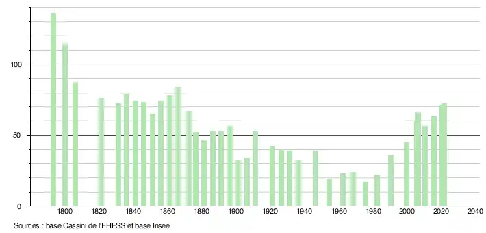 L'évolution du nombre d'habitants est connue à travers les recensements de la population effectués dans la commune depuis 1793. Pour les communes de moins de 10 000 habitants, une enquête de recensement portant sur toute la population est réalisée tous les cinq ans, les populations légales des années intermédiaires étant quant à elles estimées par interpolation ou extrapolation[20]. Pour la commune, le premier recensement exhaustif entrant dans le cadre du nouveau dispositif a été réalisé en 2005[21].