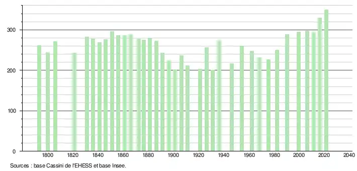 Veuillez insérer votre texte après L'évolution du nombre d'habitants est connue à travers les recensements de la population effectués dans la commune depuis 1793. Pour les communes de moins de 10 000 habitants, une enquête de recensement portant sur toute la population est réalisée tous les cinq ans, les populations légales des années intermédiaires étant quant à elles estimées par interpolation ou extrapolation[27]. Pour la commune, le premier recensement exhaustif entrant dans le cadre du nouveau dispositif a été réalisé en 2006[28].