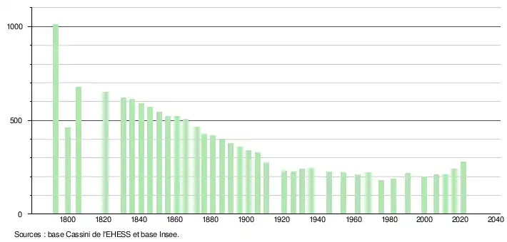 L'évolution du nombre d'habitants est connue à travers les recensements de la population effectués dans la commune depuis 1793. Pour les communes de moins de 10 000 habitants, une enquête de recensement portant sur toute la population est réalisée tous les cinq ans, les populations légales des années intermédiaires étant quant à elles estimées par interpolation ou extrapolation[23]. Pour la commune, le premier recensement exhaustif entrant dans le cadre du nouveau dispositif a été réalisé en 2006[24].