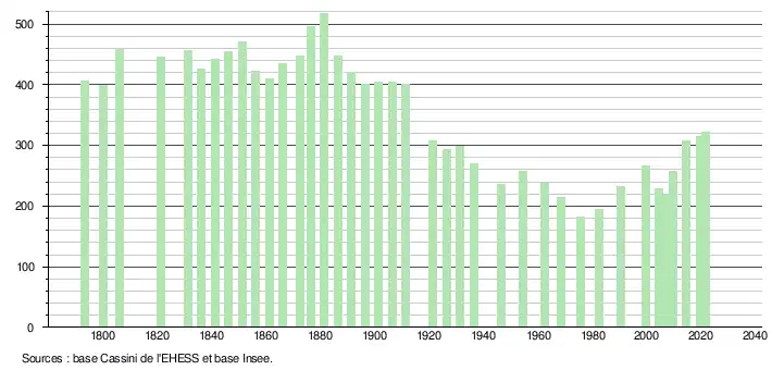 L'évolution du nombre d'habitants est connue à travers les recensements de la population effectués dans la commune depuis 1793. Pour les communes de moins de 10 000 habitants, une enquête de recensement portant sur toute la population est réalisée tous les cinq ans, les populations légales des années intermédiaires étant quant à elles estimées par interpolation ou extrapolation[20]. Pour la commune, le premier recensement exhaustif entrant dans le cadre du nouveau dispositif a été réalisé en 2004[21].