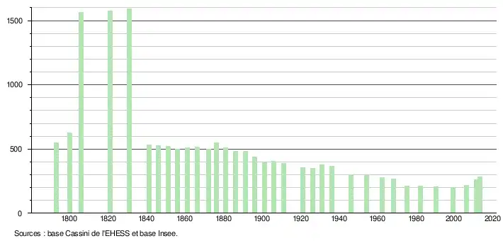 L'évolution du nombre d'habitants est connue à travers les recensements de la population effectués dans la commune depuis 1793. À partir du , les populations légales des communes sont publiées annuellement dans le cadre d'un recensement qui repose désormais sur une collecte d'information annuelle, concernant successivement tous les territoires communaux au cours d'une période de cinq ans. Pour les communes de moins de 10 000 habitants, une enquête de recensement portant sur toute la population est réalisée tous les cinq ans, les populations légales des années intermédiaires étant quant à elles estimées par interpolation ou extrapolation[3]. Pour la commune, le premier recensement exhaustif entrant dans le cadre du nouveau dispositif a été réalisé en 2006[4],[Note 1].