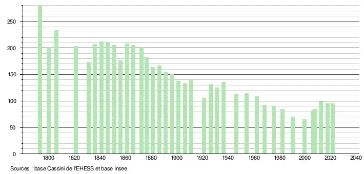 L'évolution du nombre d'habitants est connue à travers les recensements de la population effectués dans la commune depuis 1793. Pour les communes de moins de 10 000 habitants, une enquête de recensement portant sur toute la population est réalisée tous les cinq ans, les populations légales des années intermédiaires étant quant à elles estimées par interpolation ou extrapolation[22]. Pour la commune, le premier recensement exhaustif entrant dans le cadre du nouveau dispositif a été réalisé en 2007[23].