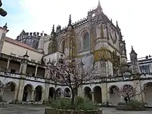 Vue de la tour polygonale du couvent du Christ. Une partie de la nef de style manuélin apparaît derrière l'église ronde.