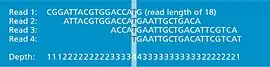 Ce nombre de lecture s'appelle donc la couverture (ou la profondeur) et représente le nombre de lectures uniques concernant un nucléotide donné dans la séquence reconstruite[1],[2]. Si une base est couverte par 30 séquences, elle aura donc une couverture (ou profondeur) de 30X.