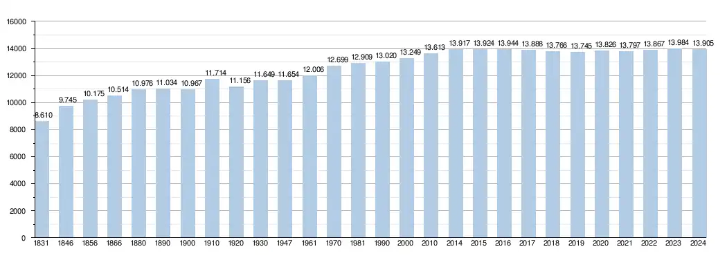 Les chiffres des années 1831 à 1970 tiennent compte des chiffres des anciennes communes fusionnées.