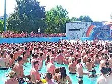 Piscine à vagues par une chaude journée d'été ; contexte propice à la dispersion dans l'eau d'une grande quantité de résidus de crème solaire (dont filtres UV)