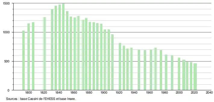 L'évolution du nombre d'habitants est connue à travers les recensements de la population effectués dans la commune depuis 1793. Pour les communes de moins de 10 000 habitants, une enquête de recensement portant sur toute la population est réalisée tous les cinq ans, les populations légales des années intermédiaires étant quant à elles estimées par interpolation ou extrapolation[38]. Pour la commune, le premier recensement exhaustif entrant dans le cadre du nouveau dispositif a été réalisé en 2005[39].
