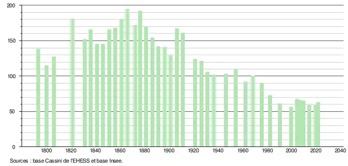 L'évolution du nombre d'habitants est connue à travers les recensements de la population effectués dans la commune depuis 1793. Pour les communes de moins de 10 000 habitants, une enquête de recensement portant sur toute la population est réalisée tous les cinq ans, les populations légales des années intermédiaires étant quant à elles estimées par interpolation ou extrapolation[24]. Pour la commune, le premier recensement exhaustif entrant dans le cadre du nouveau dispositif a été réalisé en 2004[25].