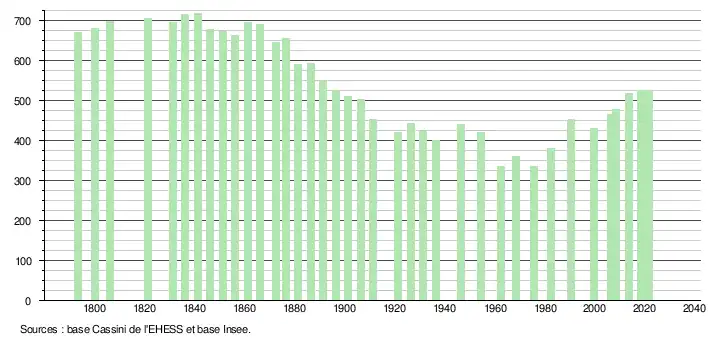L'évolution du nombre d'habitants est connue à travers les recensements de la population effectués dans la commune depuis 1793. Pour les communes de moins de 10 000 habitants, une enquête de recensement portant sur toute la population est réalisée tous les cinq ans, les populations légales des années intermédiaires étant quant à elles estimées par interpolation ou extrapolation[15]. Pour la commune, le premier recensement exhaustif entrant dans le cadre du nouveau dispositif a été réalisé en 2008[16].