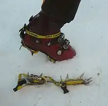 Un crampon est un équipement en alpinisme qui s'utilise par paire et comporte un nombre variable de pointes. Il se fixe sous la chaussure pour permettre la progression sur la neige et la glace[1]. Les crampons classiques conçus pour l'alpinisme ou la randonnée glaciaire sont peu adaptés à l'escalade glaciaire. Pour la pratique de la cascade de glace, des crampons spécifiques fournissant un meilleur cramponnage frontal sont recommandés. La plupart des crampons requièrent des chaussures « cramponnables », à semelle rigide pour une meilleure efficacité.