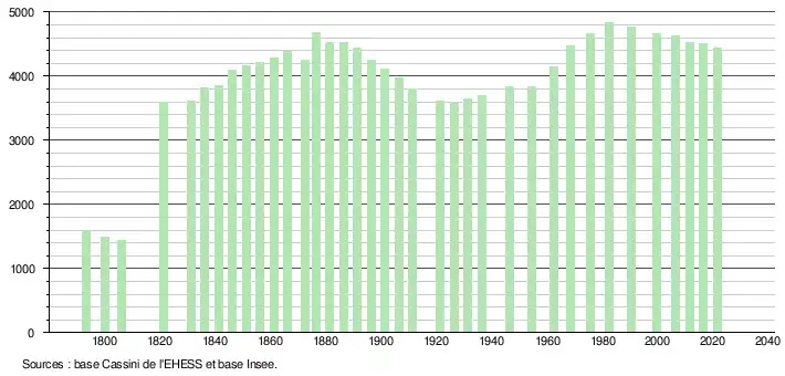 - Population municipale légale en vigueur au 1er janvier 2024, millésimée 2021, définie dans les limites territoriales en vigueur au 1er janvier 2023, date de référence statistique : 1er janvier 2021.