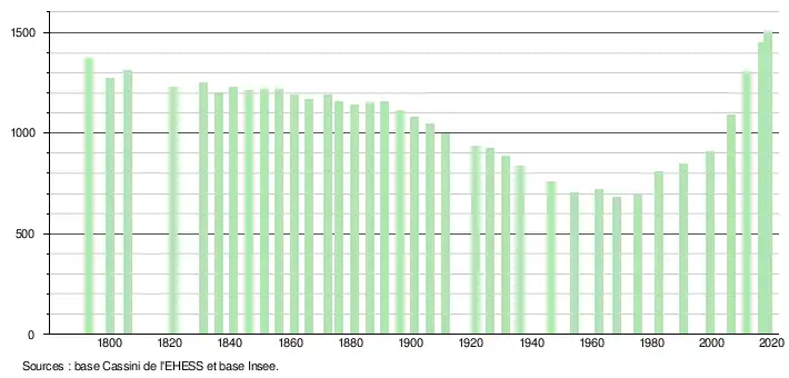 L'évolution du nombre d'habitants est connue à travers les recensements de la population effectués dans la commune depuis 1793. Pour les communes de moins de 10 000 habitants, une enquête de recensement portant sur toute la population est réalisée tous les cinq ans, les populations légales des années intermédiaires étant quant à elles estimées par interpolation ou extrapolation[2]. Pour la commune, le premier recensement exhaustif entrant dans le cadre du nouveau dispositif a été réalisé en 2006[3].