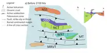 - Magmatisme granitoïde[17] - Métamorphisme formant des amphibolites causé par l'accrétion tectonique[2] |