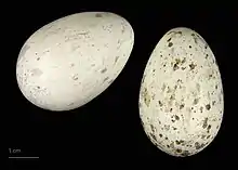 La femelle pond en général quatre ou cinq œufs, les couvées de trois ou six œufs étant relativement peu fréquentes[21], celles d'un seul exceptionnelles[11]. La taille de ces œufs a pour valeurs extrêmes 34,3-42,0 mm × 21,5-29,5 mm[21], et leur poids moyen est de 15,7 grammes, dont 6 % de coquille[6]. Ils sont elliptiques, lisses et brillants[11], plus ou moins tachetés et de couleurs très variables, allant de diverses nuances de brun et de gris vers le crème et l'ocre[4]. Les dimensions des œufs sont indépendantes de la taille de la nichée et de l'emplacement du nid, mais peuvent varier d'une femelle à l'autre[26].