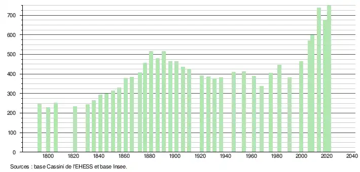 L'évolution du nombre d'habitants est connue à travers les recensements de la population effectués dans la commune depuis 1793. Pour les communes de moins de 10 000 habitants, une enquête de recensement portant sur toute la population est réalisée tous les cinq ans, les populations légales des années intermédiaires étant quant à elles estimées par interpolation ou extrapolation[27]. Pour la commune, le premier recensement exhaustif entrant dans le cadre du nouveau dispositif a été réalisé en 2008[28].
