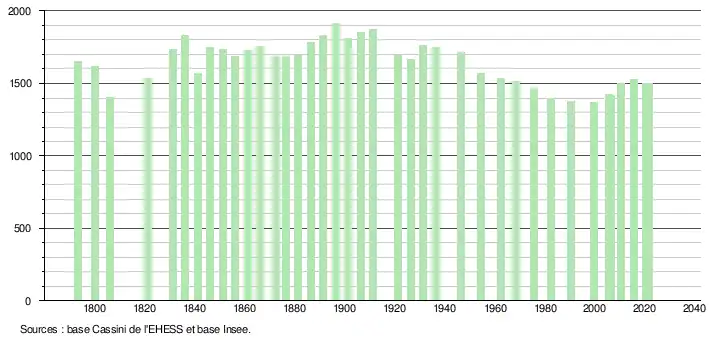 L'évolution du nombre d'habitants est connue à travers les recensements de la population effectués dans la commune depuis 1793. Pour les communes de moins de 10 000 habitants, une enquête de recensement portant sur toute la population est réalisée tous les cinq ans, les populations légales des années intermédiaires étant quant à elles estimées par interpolation ou extrapolation[29]. Pour la commune, le premier recensement exhaustif entrant dans le cadre du nouveau dispositif a été réalisé en 2005[30].